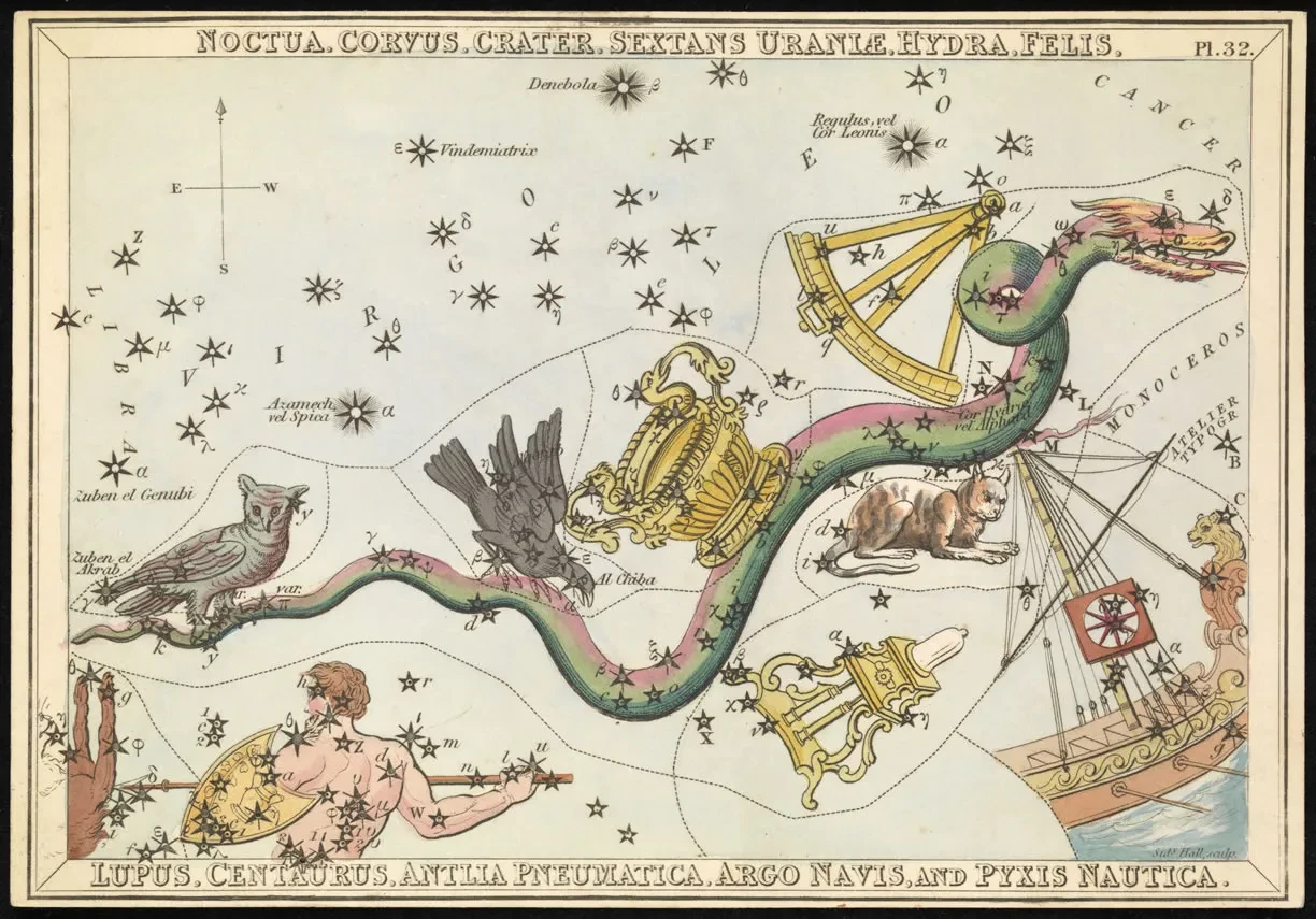 Looking southwards after sunset, we find the constellation Corvus, the crow. It is certainly a test of the imagination to trace a crow out of the four bright stars of Corvus, which form a quadrilateral. It's more suggestive of a tent, as Arab astronomers described it, or the sail of a ship in old nautical tradition.