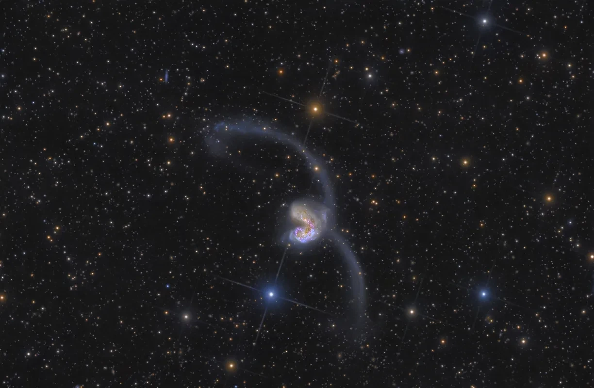 Located to the right of the quadrilateral shape of Corvus sits one of the most dramatic scenes in the Universe - the Antennae Galaxies. These are a pair of colliding galaxies located around 66 million light years away. The merger is triggering a massive starburst phase as gas clouds collide, creating billions of new stars. A larger telescope is needed to appreciate this object, as it is about 100 times too dim for the naked eye.