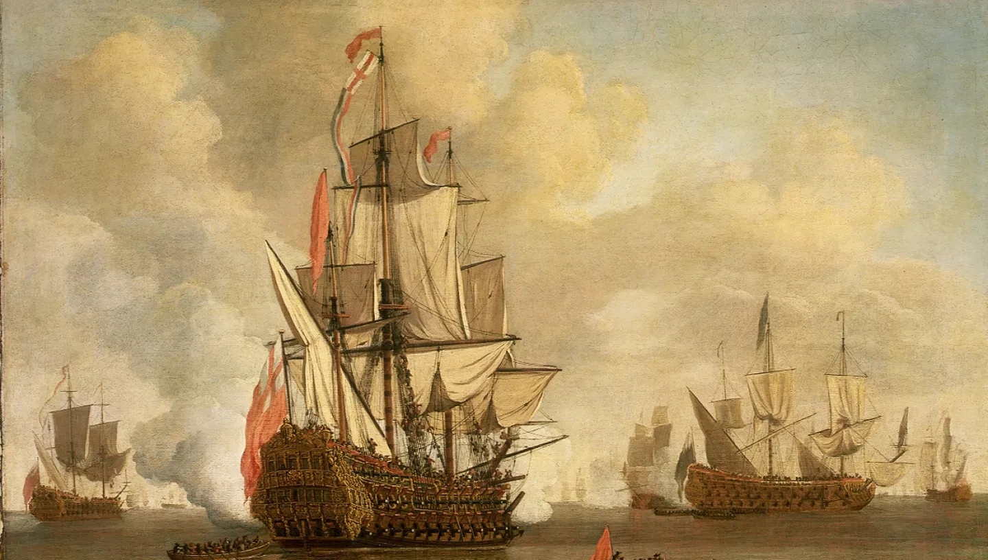 Image banner: Calm: an English two-decker with sails loosed firing a salute. By William van de Velde the elder, 1682